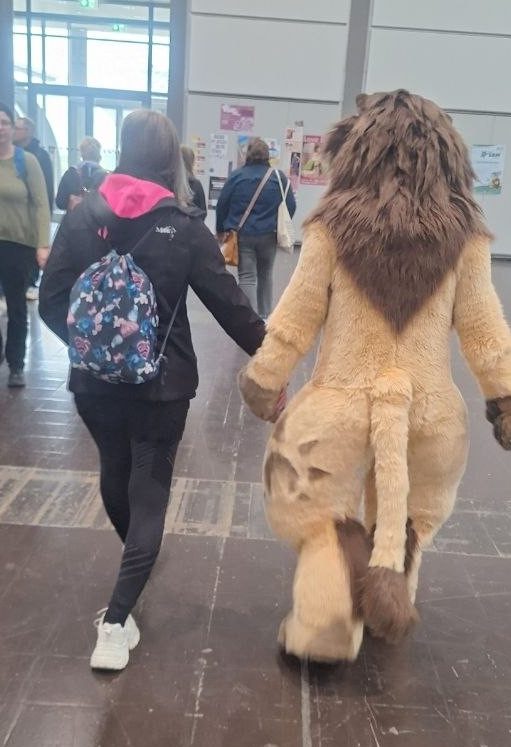 Und dann kam der Samstag. Der Tag, an dem ich lernte, wie bunt die LBM werden kann. Und ich mittendrin, als ich einen Löwen an der Hand durch die Hallen geleiten durfte, bis wir den Treffpunkt der Furry-Community erreichten. Sie war groß – schätzungsweise 200 Furrys, die sich wie eine farbenfrohe Herde über den Platz bewegten. Willkommen im Wunderland.